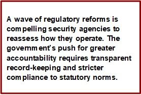 A new swell of regulatory reforms is forcing security agencies to rethink the way they operate. The government’s drive for greater accountability and compliance now demands transparent record-keeping and far stricter conformity with statutory requirements.